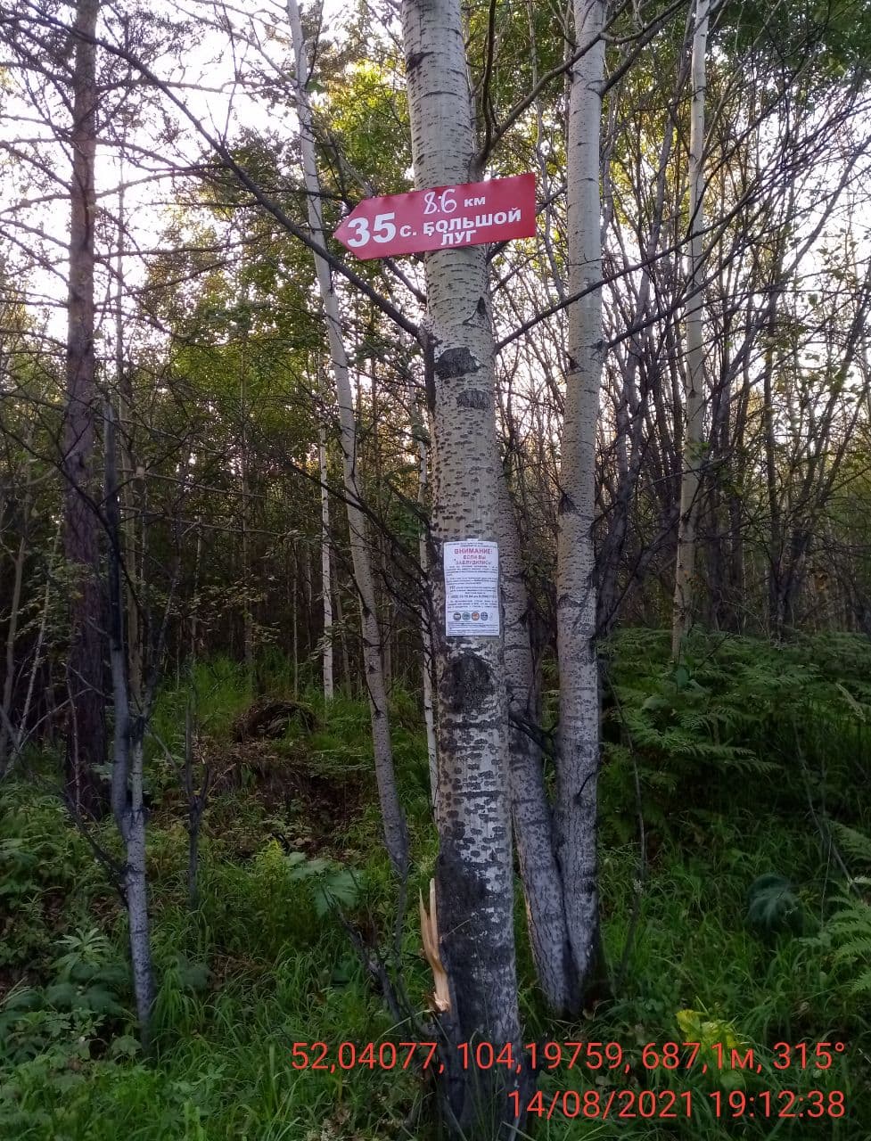 Установлена на развилке лесных дорог, магнитный азимут 235°