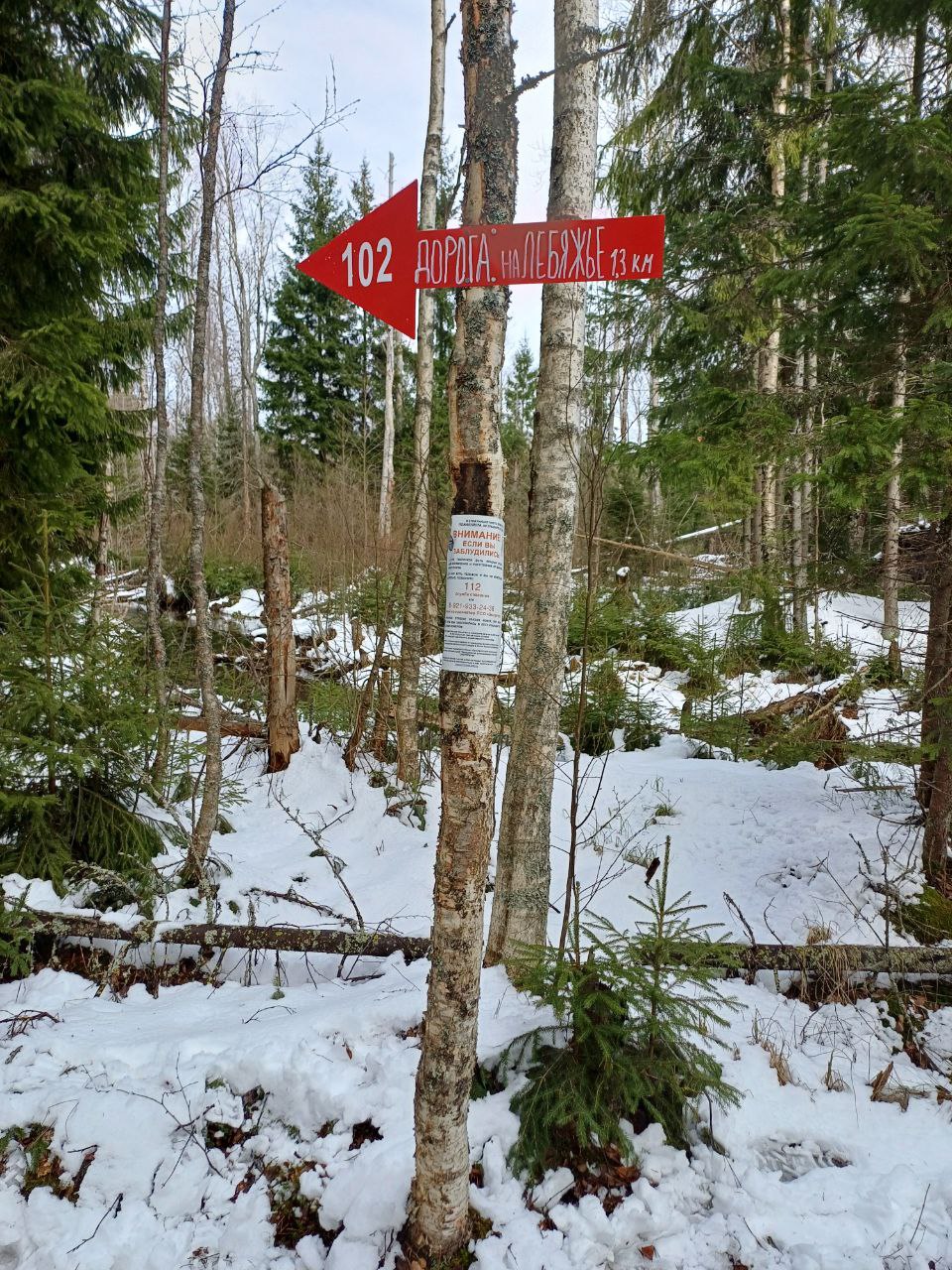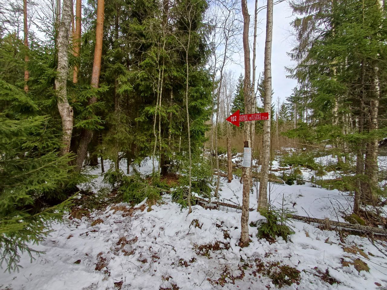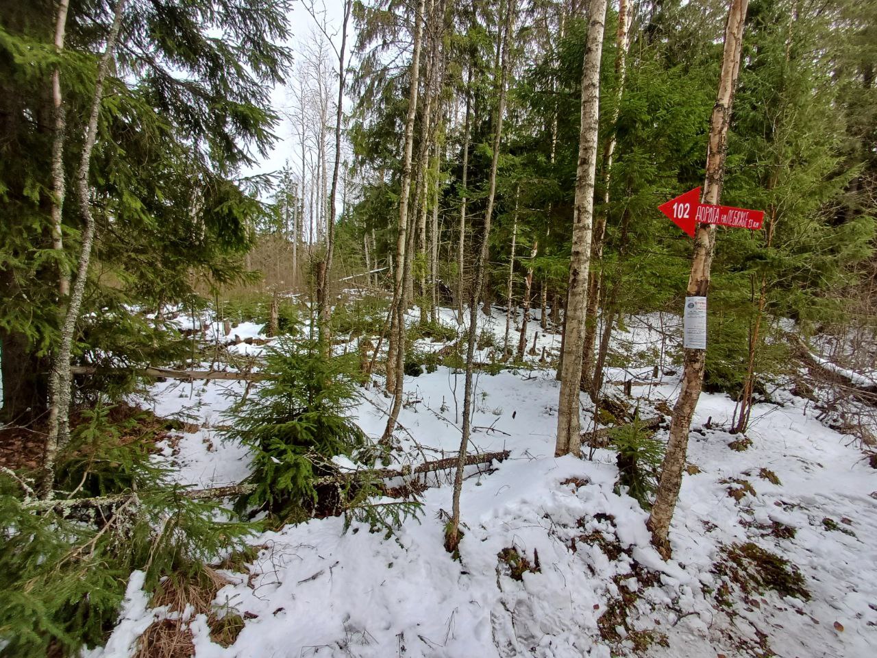 Стоит с западной стороны канавы. Через пару ёлок выводит мимо поворота канавы на тропинку на север.