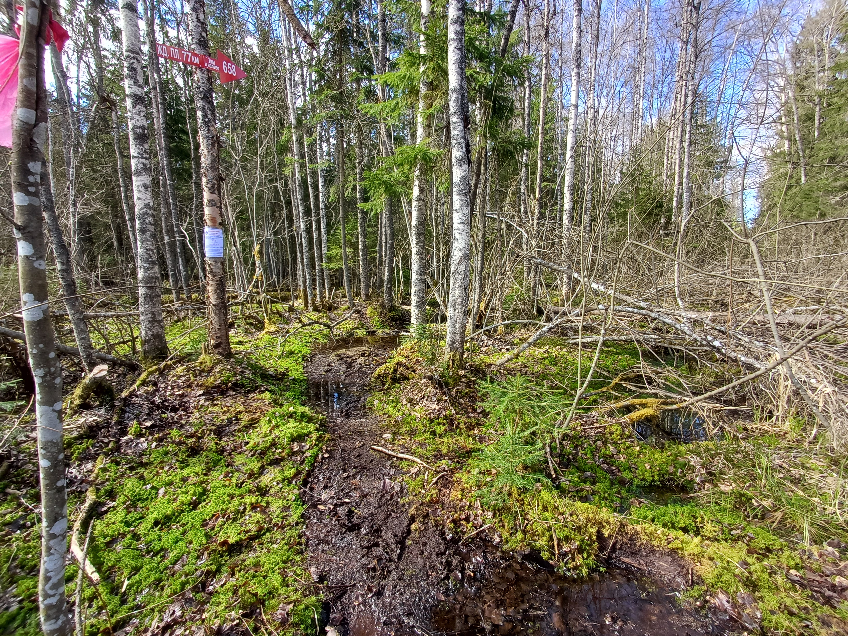 Стрелка установлена через 20 м после того, как просека перешла в тропу, ведущую в сторону болота, тропа продолжает быть маркирована тряпочками, но идет через молодняк и болота еще не видно |