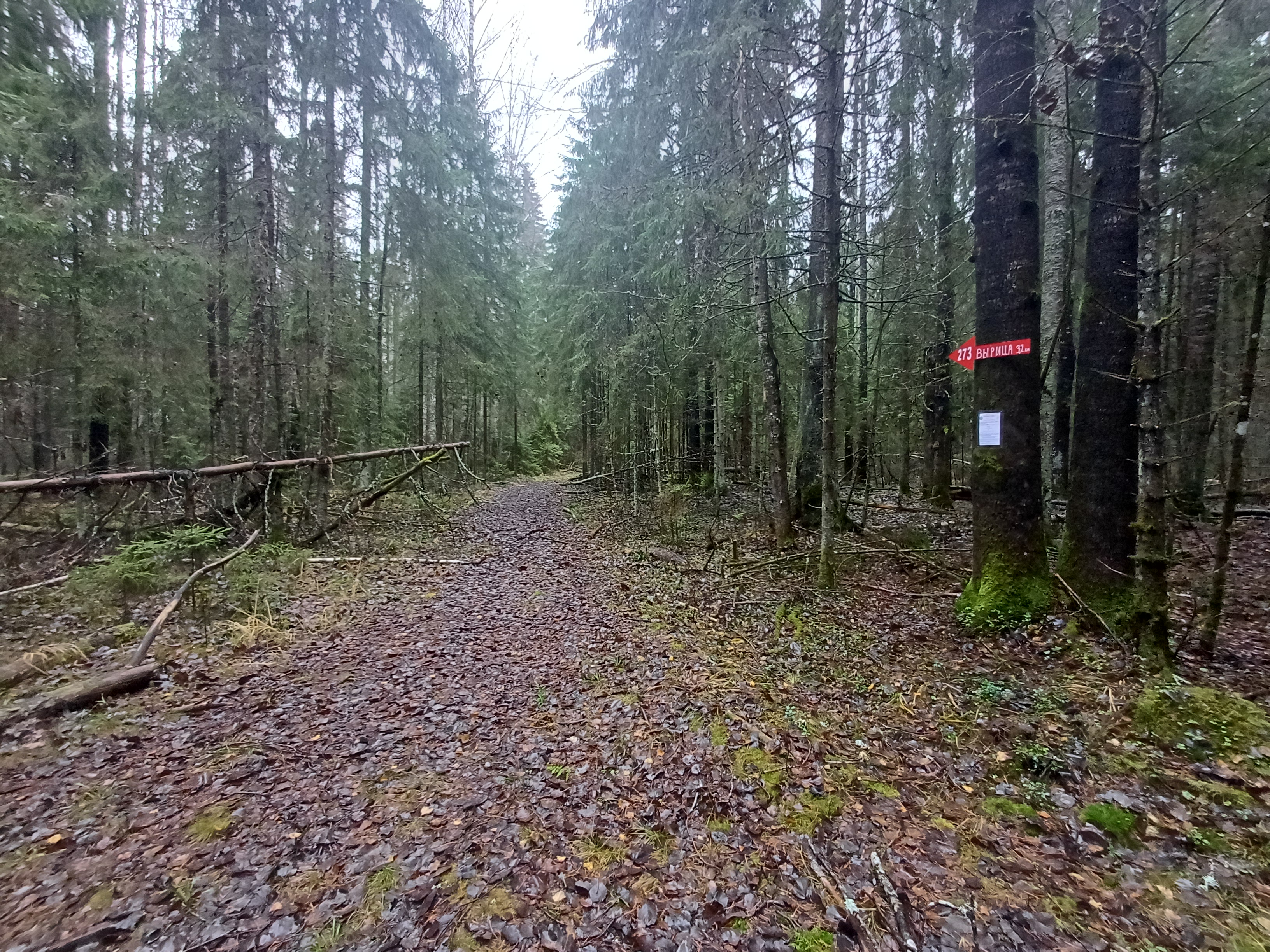 На развилке равнозначных лесных дорог (другая - на СЗ). Через 180м другая развилка: на СВ набитая тропа на Красницы, на ЮВ продолжается дорога (на данной развилке на толстом дереве краской стрелка на Вырицу)