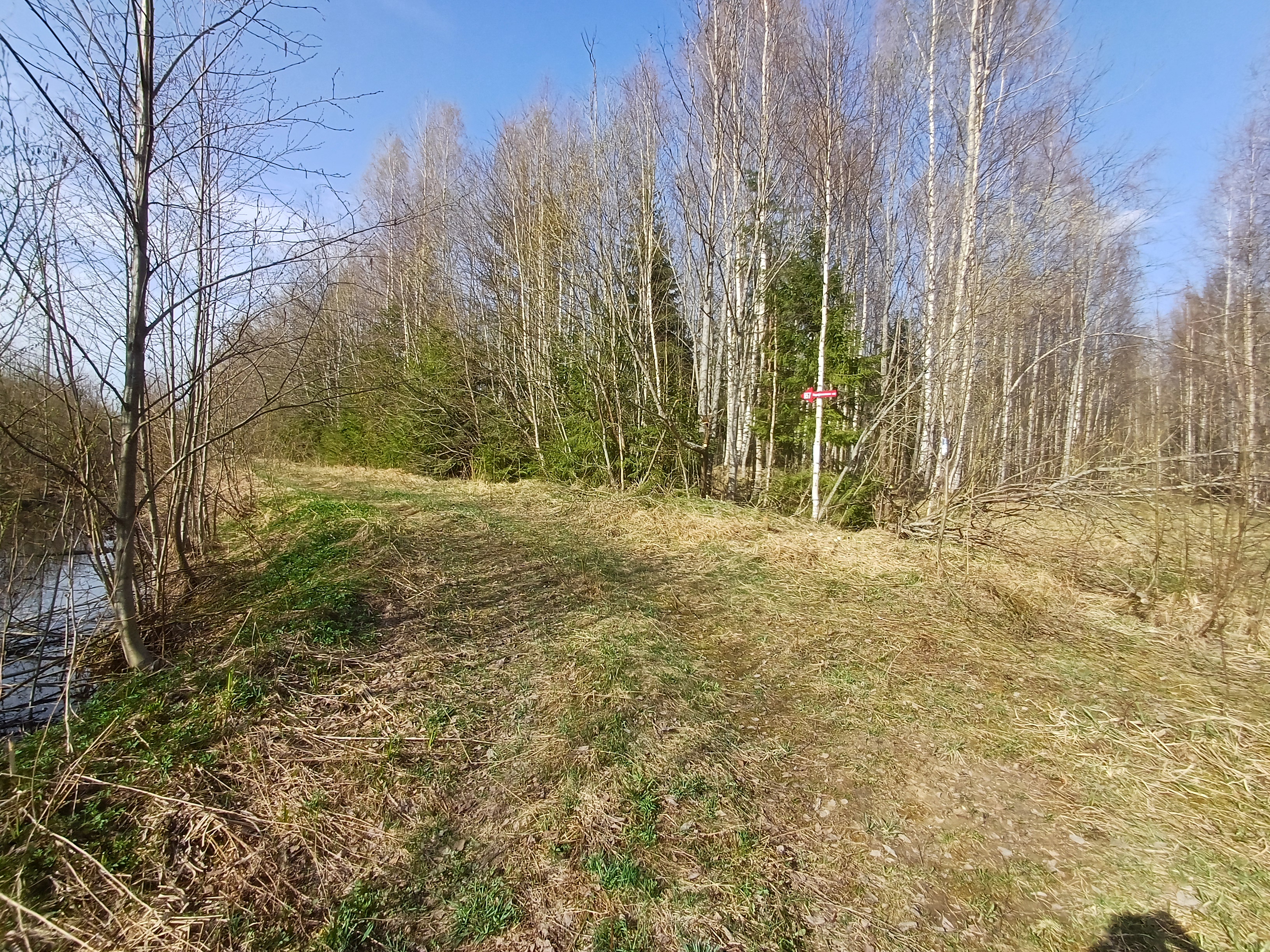 Установлена на перекрестке, указывает на движение по лэп. С ЮЗ к лэп примыкает (поворачивает налево) дорога с Поддубья. На СВ в сторону садоводств также есть дорожка (не проверена). На ЮВ по лэп можно дойти до р.Рыденка, в апреле под разливом видна переправа из бревен.