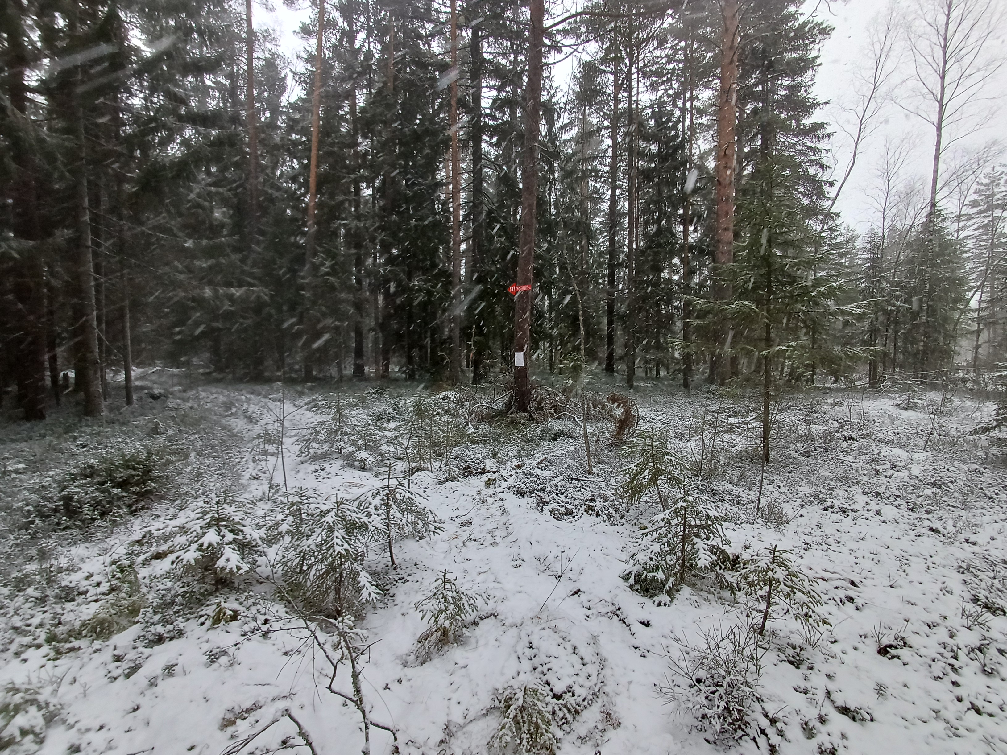 На перекрестке (дороги во все стороны, но на С наименее четкая). При выходе через 100м четкая дорога превращается в тропу (пометки краской на стволах, держаться чуть севернее), через 200м тропа опять становится дорогой.