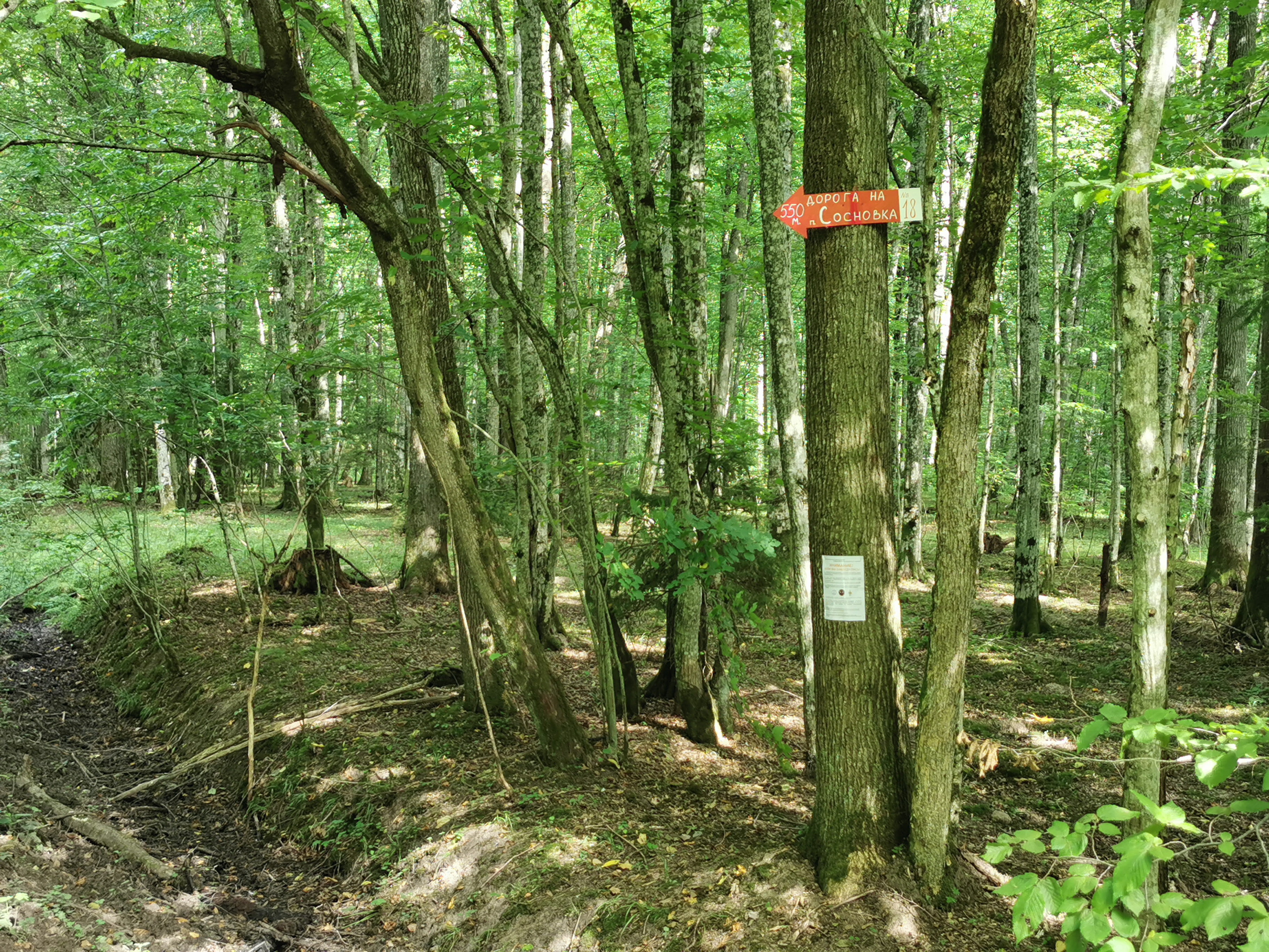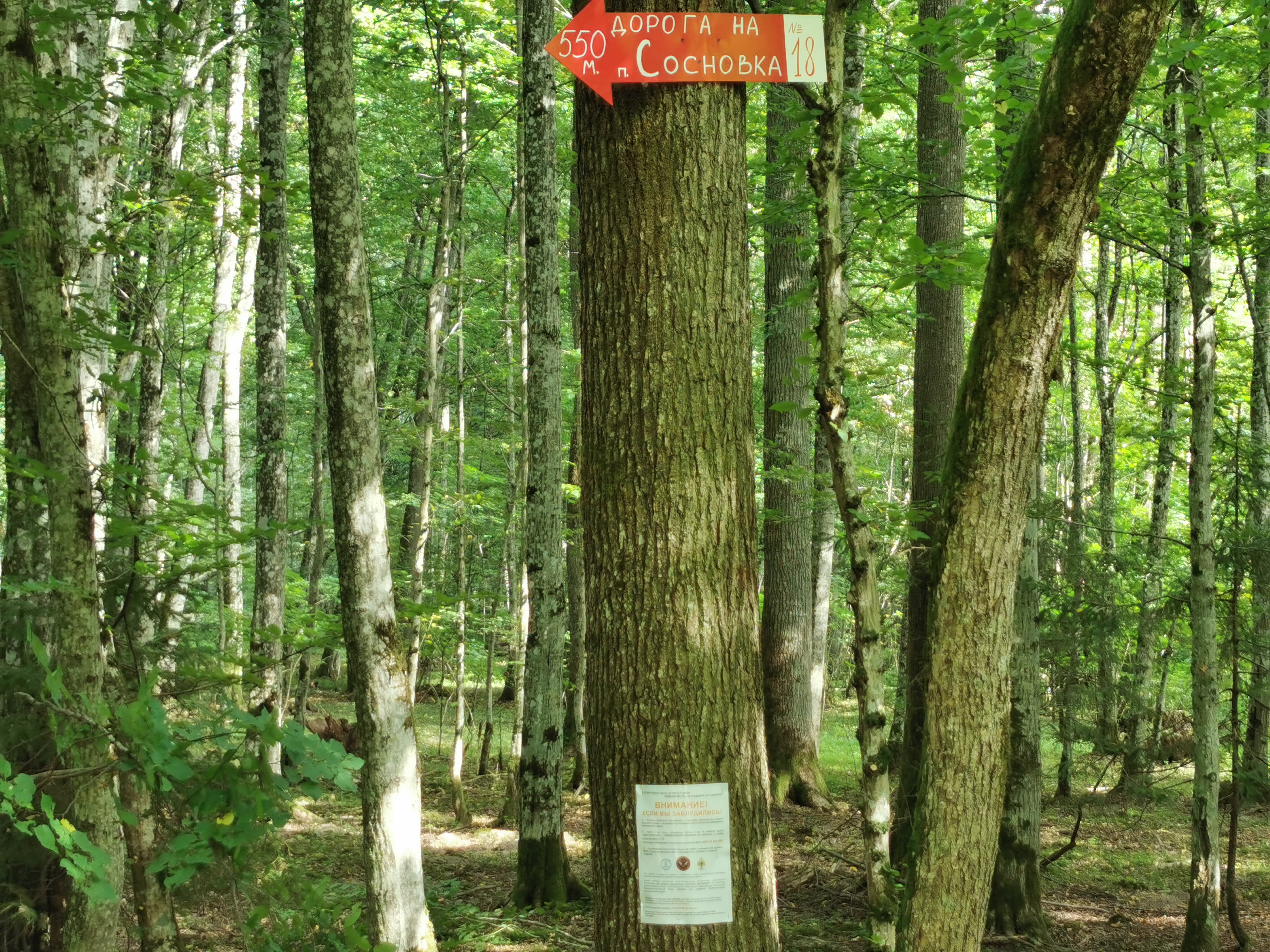 Стрелка установлена на перекрестке лесных дорог, указывает на главную дорогу, ведущую в пос. Сосновка