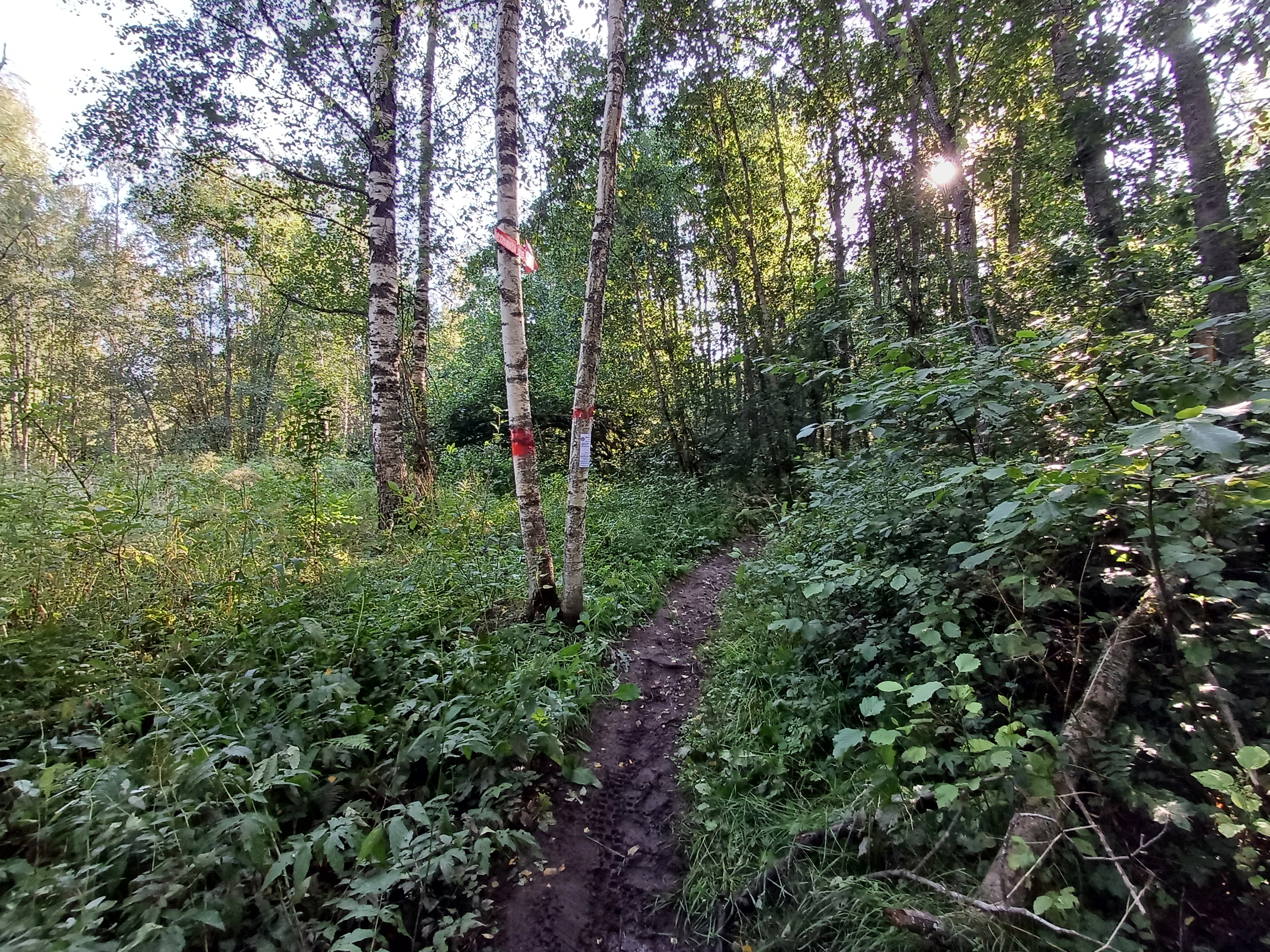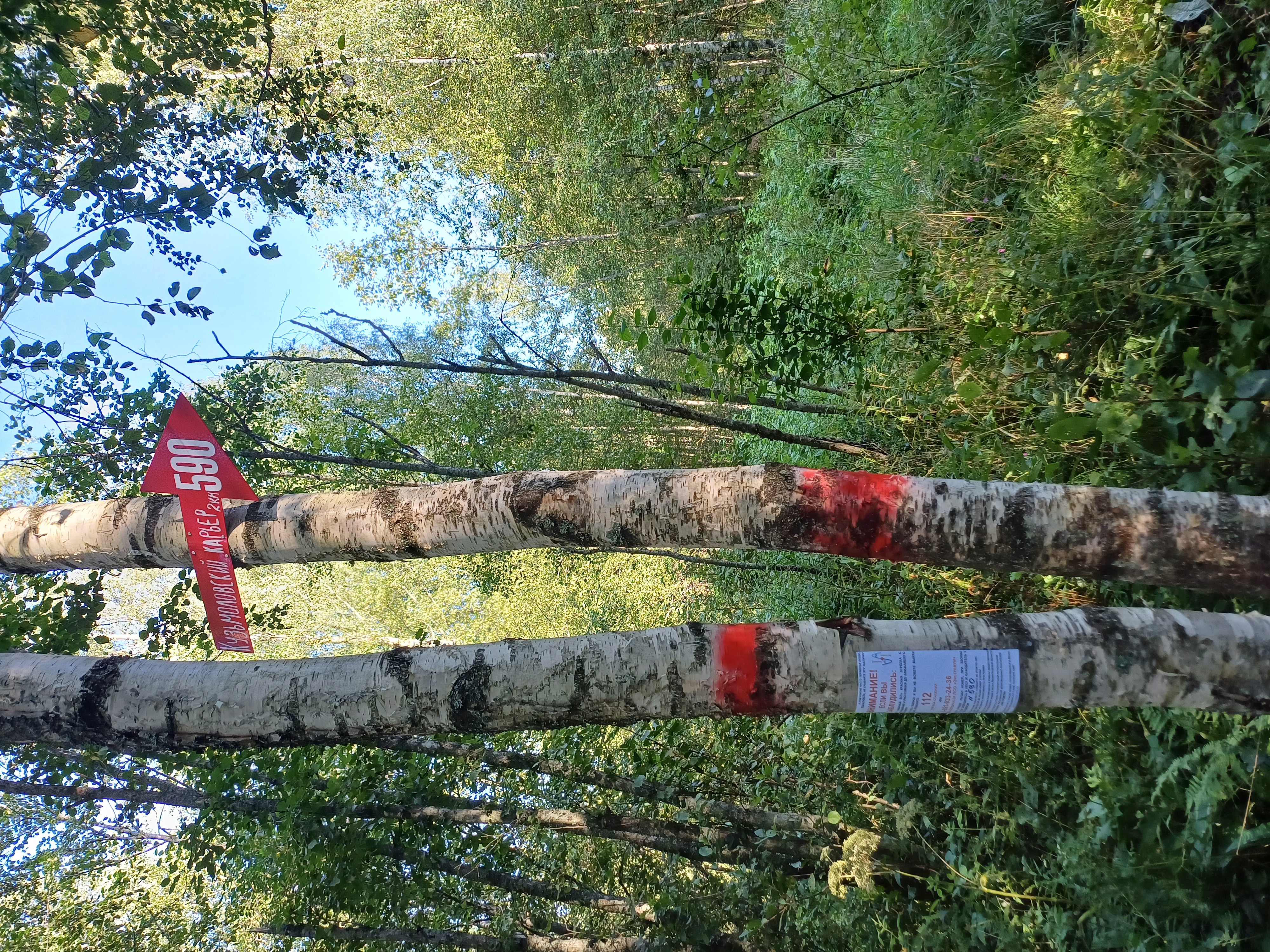 Стоит четкой на лесной дорожке (далее на В продолжается), активно используемой ездоками на эндуро/лыжниками. С юга дорожки на всём пути сильно заросший кустарником подлесок, никаких проходов к канавам на юг нет, на север есть несколько ответвлений (подъем вверх). После поворота (через 2 км) на С дорога вдоль карьера ветвится и имеет значительные перепады высот