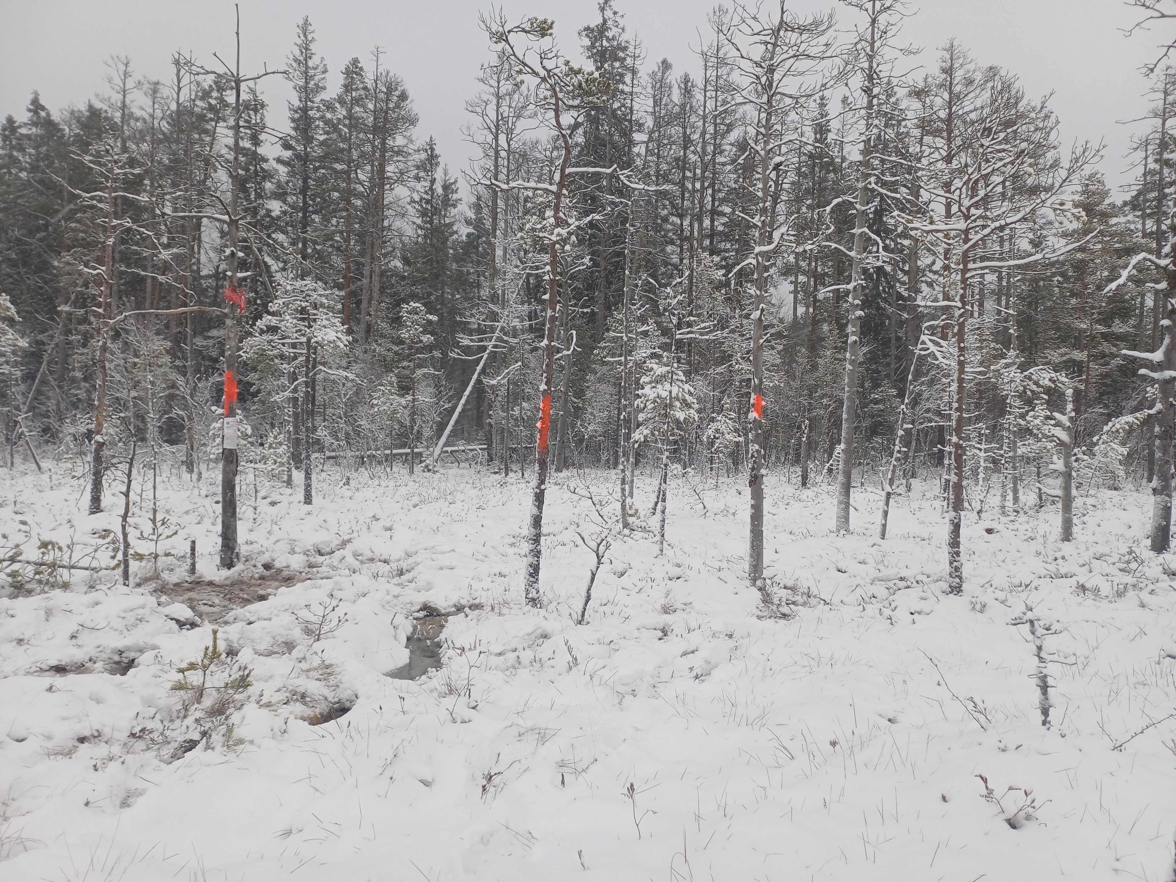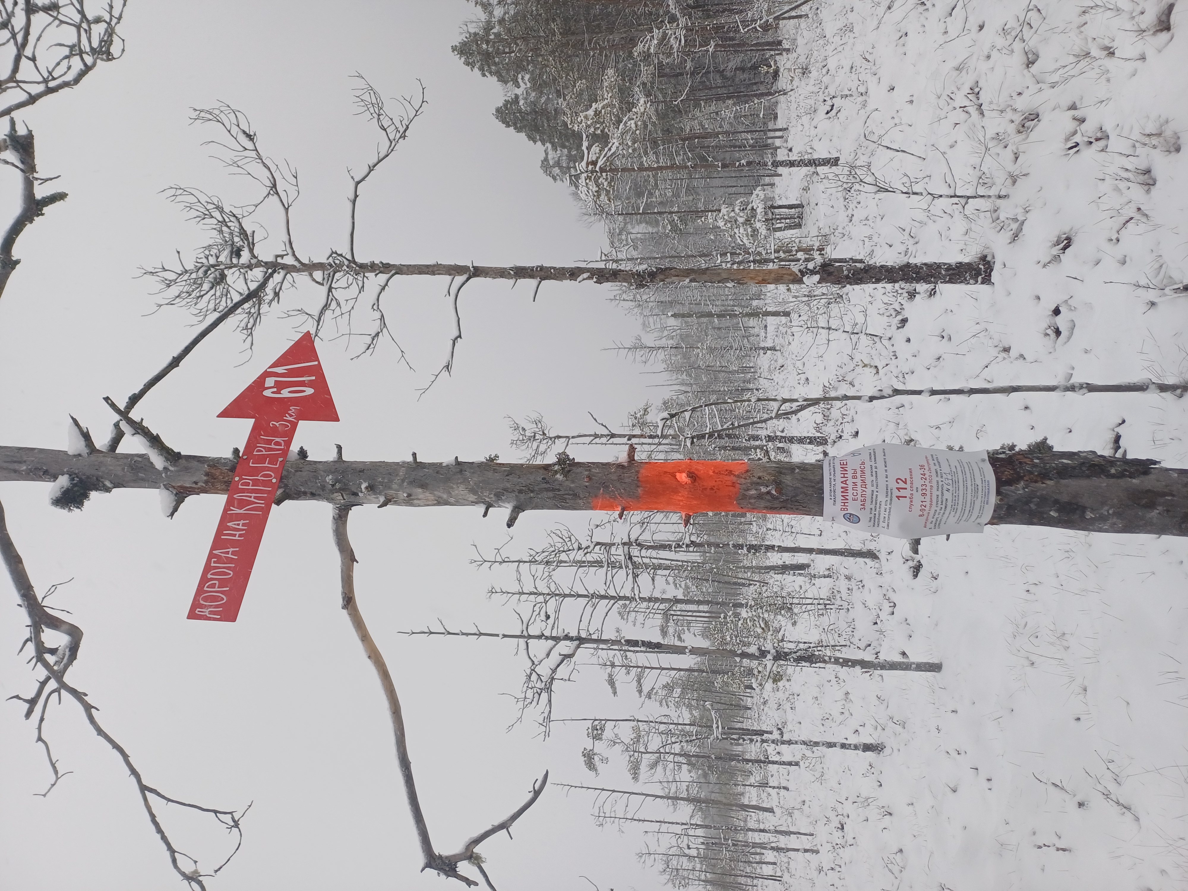 Вход в лес с болота (сам вход по мокрой колее, мокрая граница леса/болота, но сзади стрелки болото сухое, есть колеи вдоль леса), на поляну с бревнами и биваком. Выход далее по широкой лесной дороге ("виляет" первые 500м)