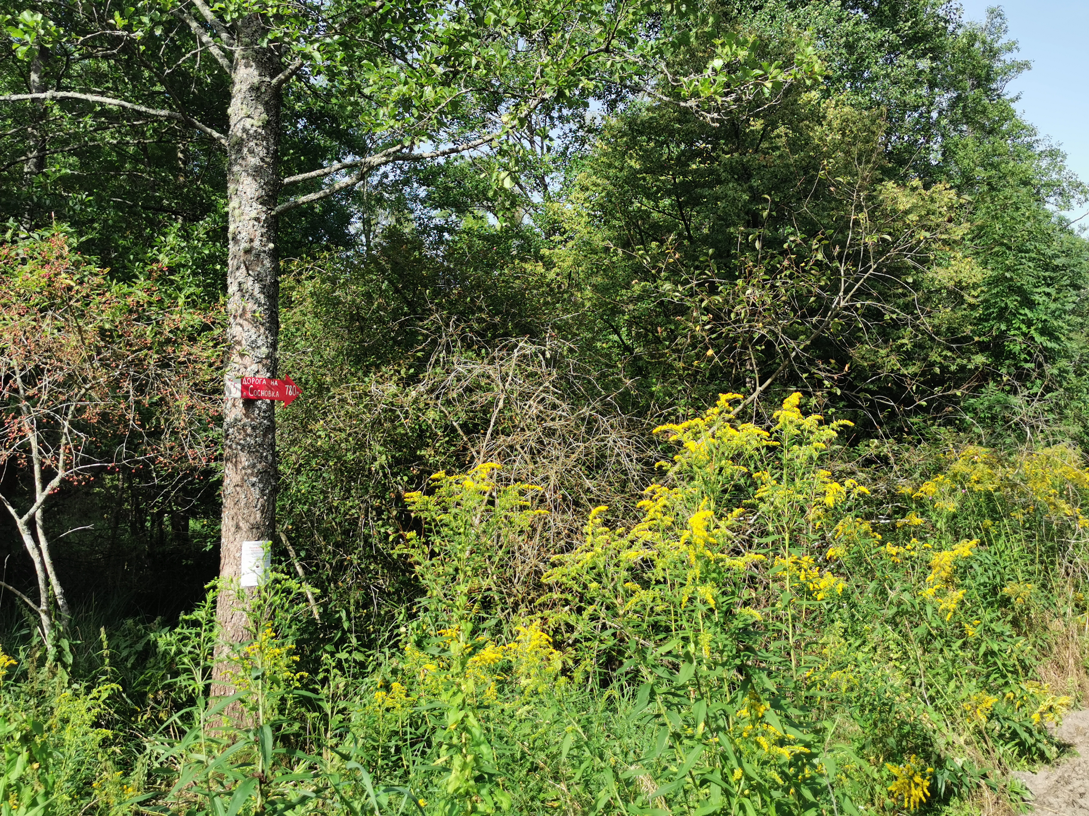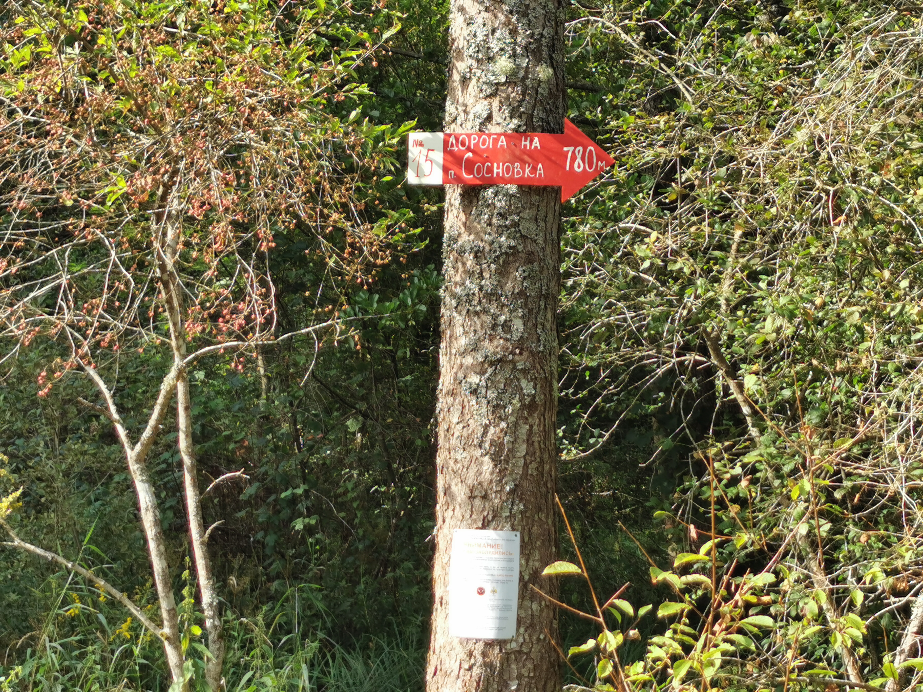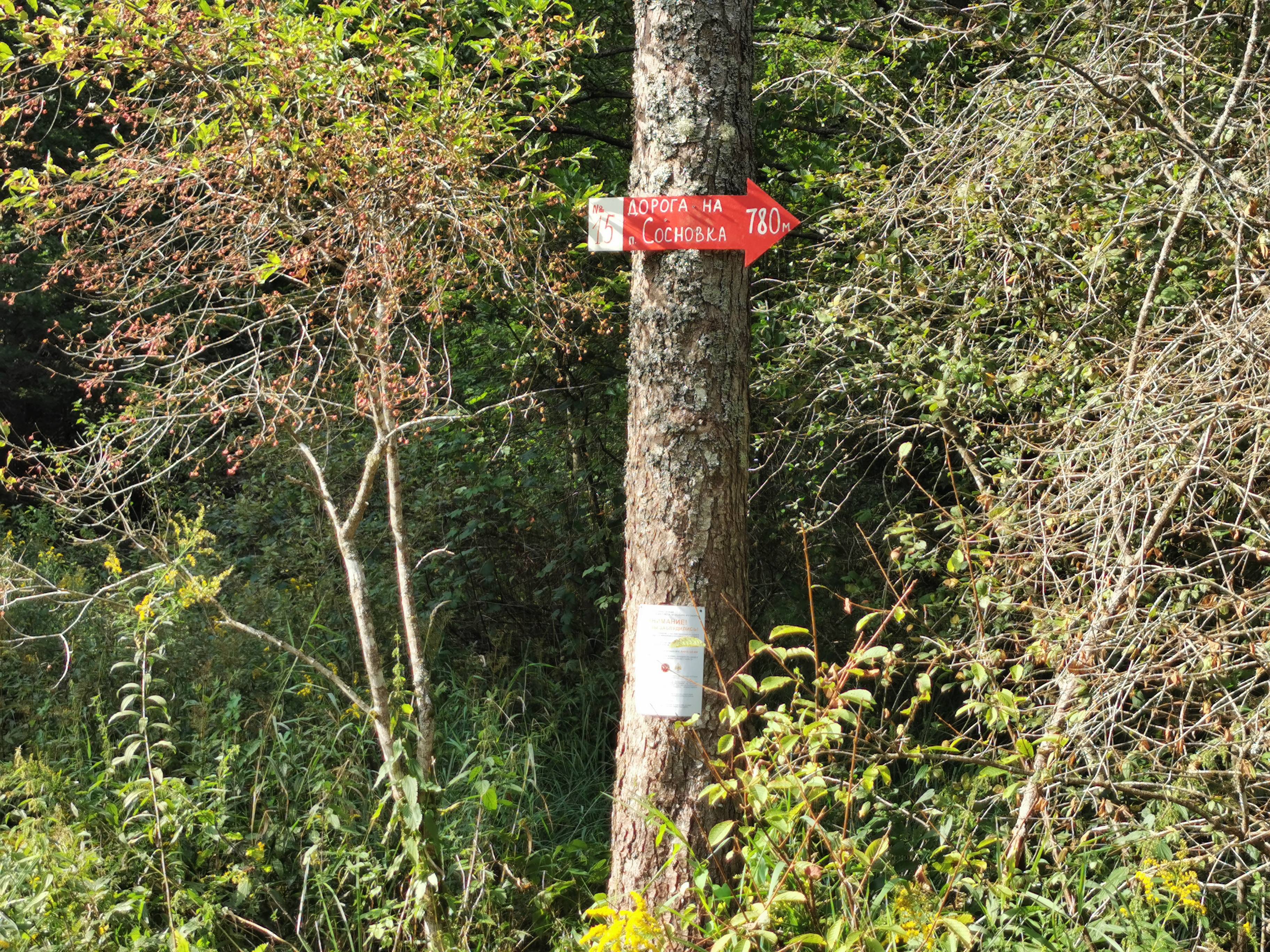 Стрелка установлена на перекрестке лесных дорог, указывает на главную дорогу, ведущую в пос. Сосновка