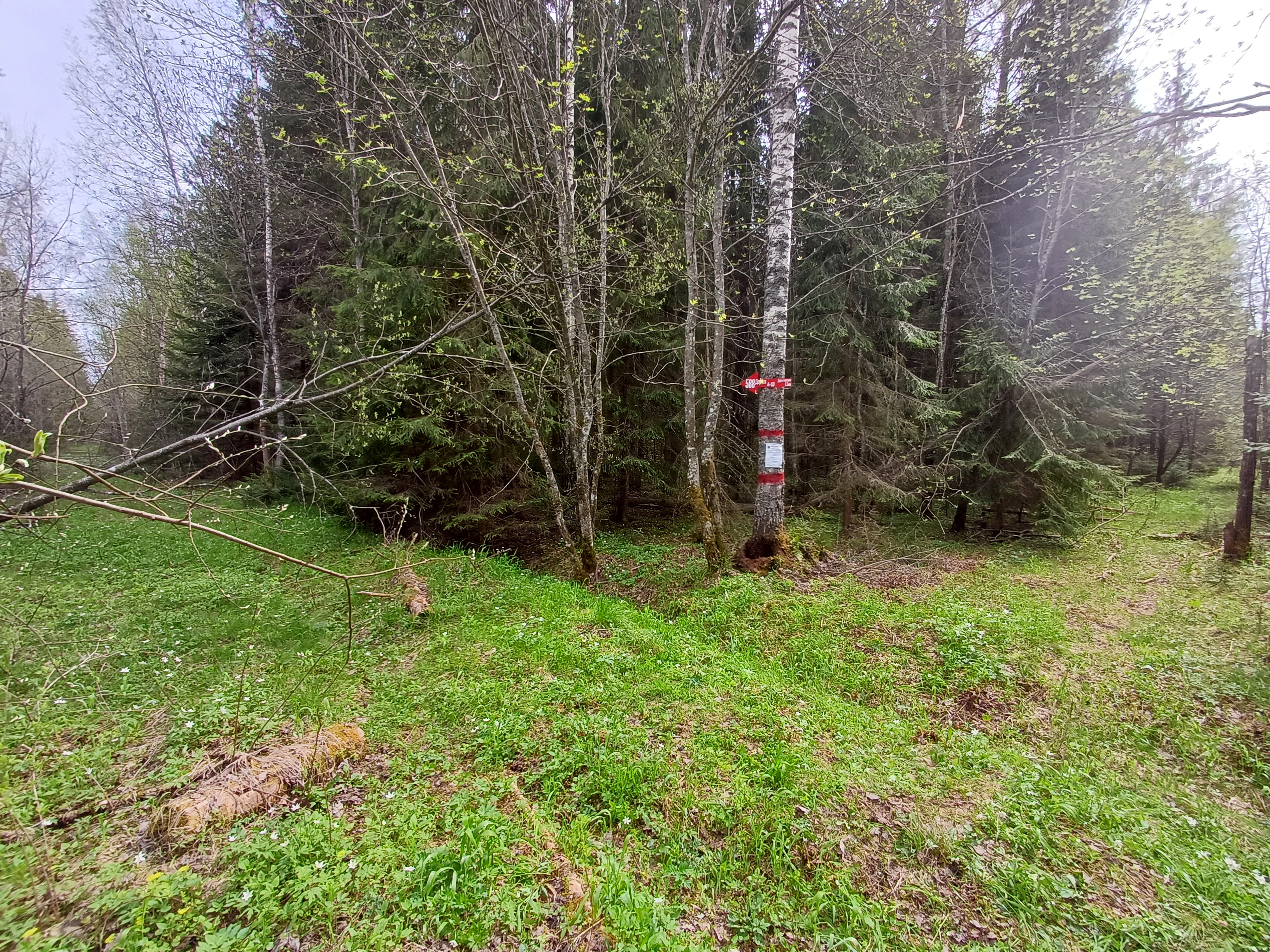 Стоит на Т-образном перекрестке (на юг просека к ЛЭП). Выводит по хорошо читаемой, местами заболоченной просеке 1 км до бывш.усадьбы Каменка (ничего не осталось). Далее поворот налево, по дороге на СВ до трассы (направо в сторону ЛЭП дорога так же имеется)